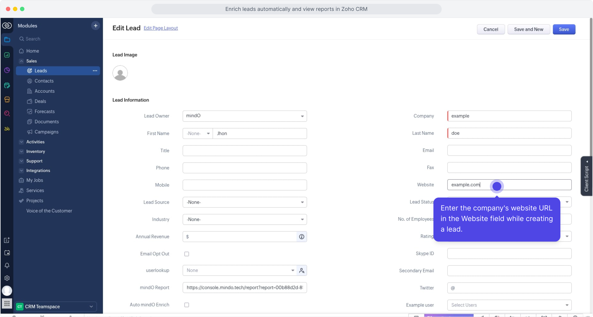 1. Create or Edit a Lead and Enter Website URL