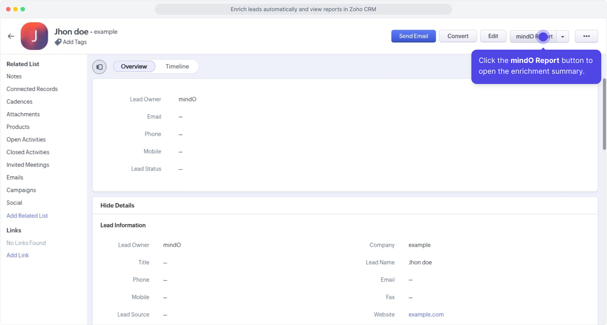 Once enrichment is completed, click the mindO Report button from the lead detail page to open the enrichment summary widget.