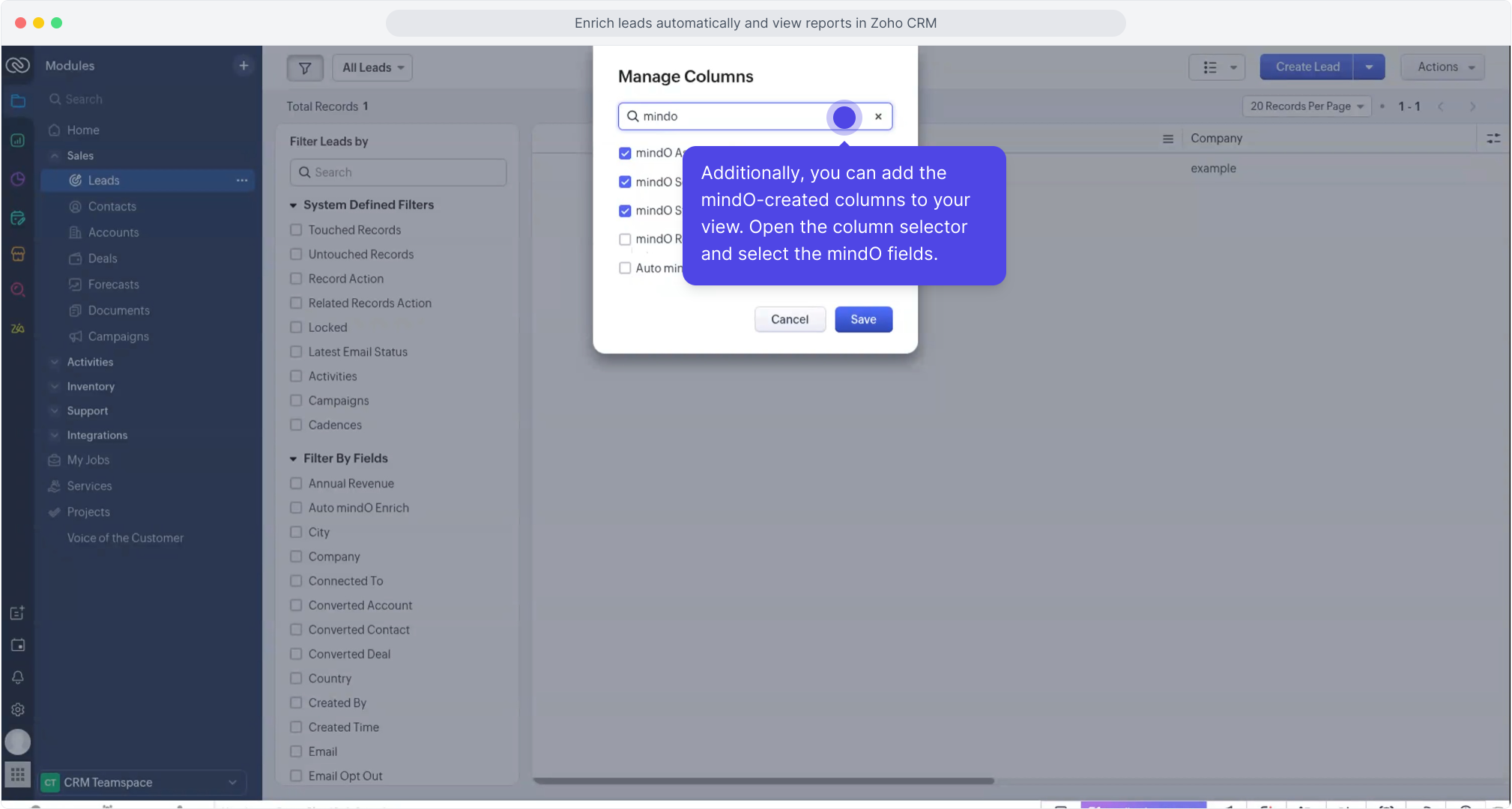 CRM admins can also add mindO-generated fields to their list view: