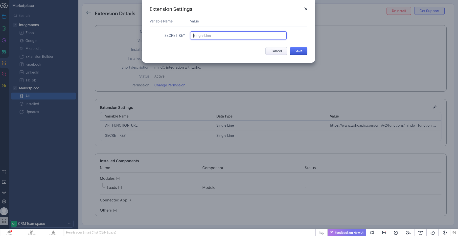 Once saved, the extension will authenticate using the secret key. If the setup is successful, your Zoho CRM will be connected to our platform.