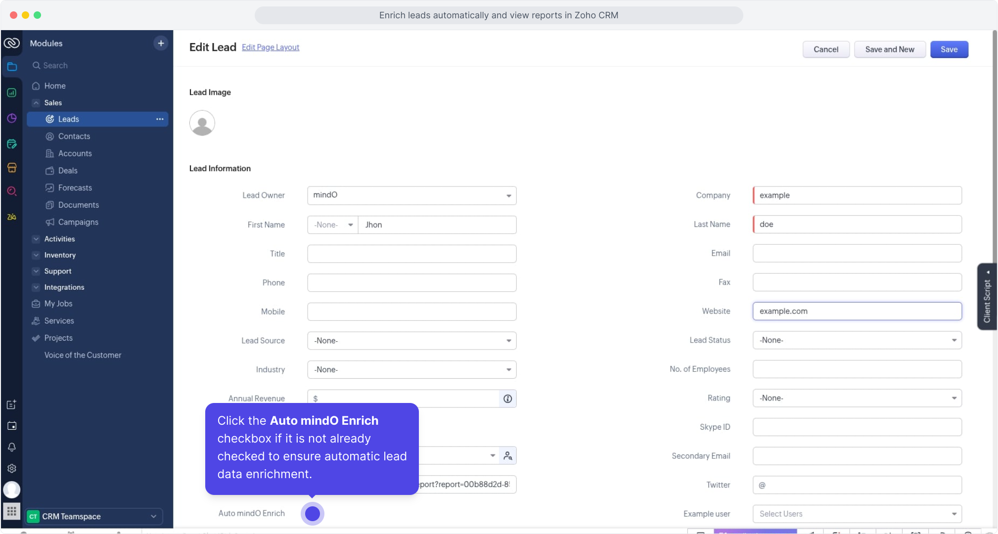 Ensure the Auto mindO Enrich checkbox is enabled so enrichment happens automatically when the lead is saved.
