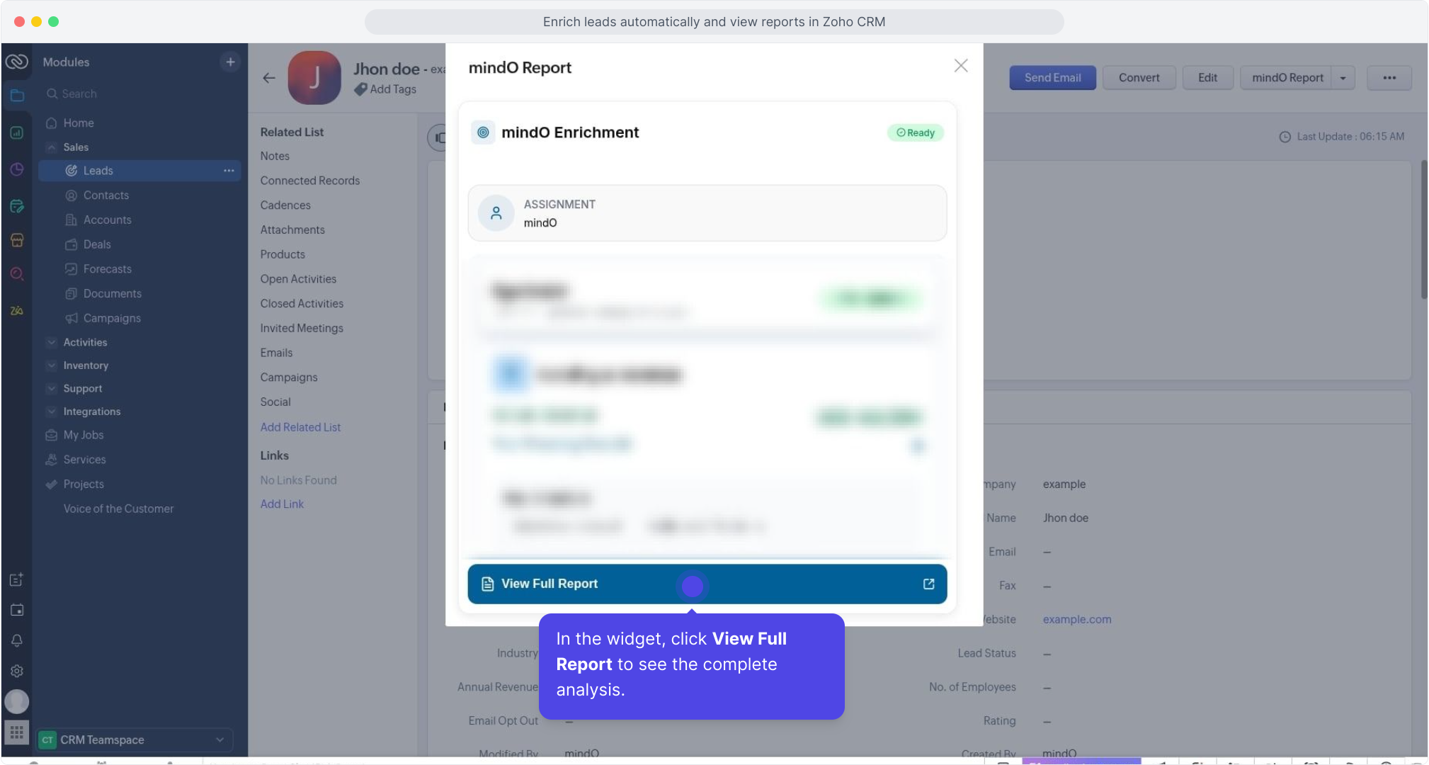 Once enrichment is completed, click the mindO Report button from the lead detail page to open the enrichment summary widget.