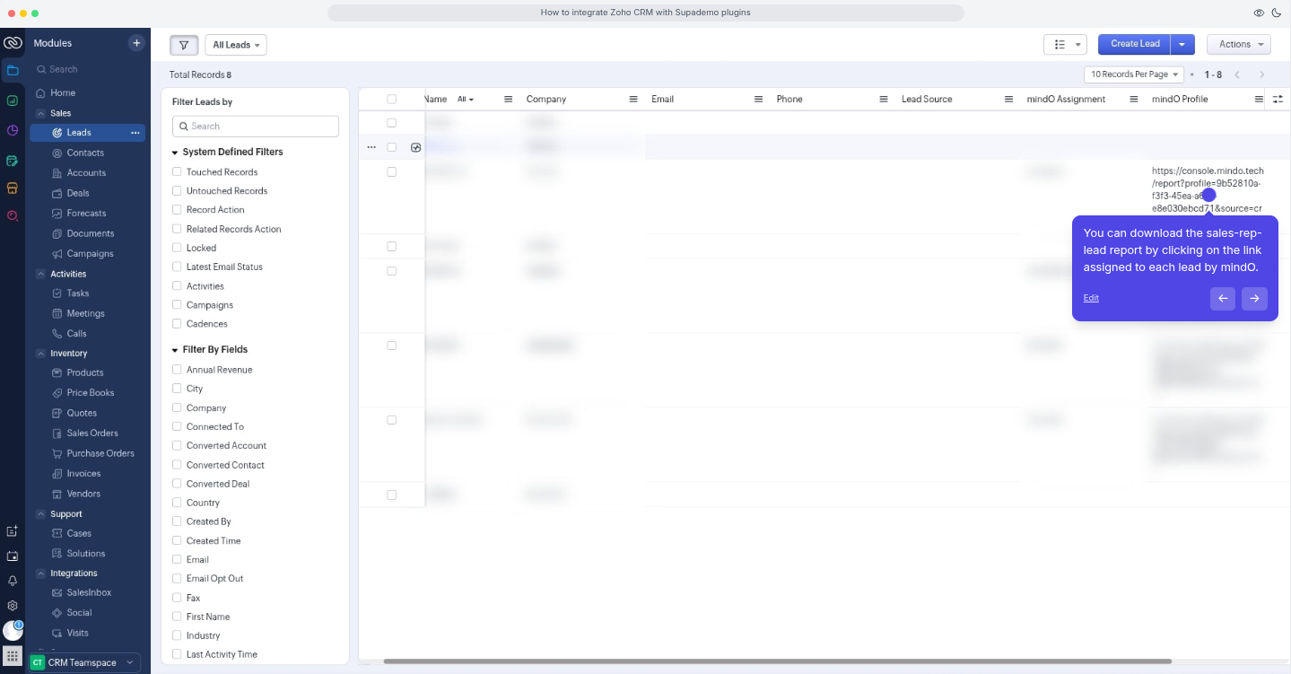 With mindO, Zoho CRM isn’t just a database of leads — it becomes a decision engine that matches the right rep to the right lead, supported by real-time compatibility insights.